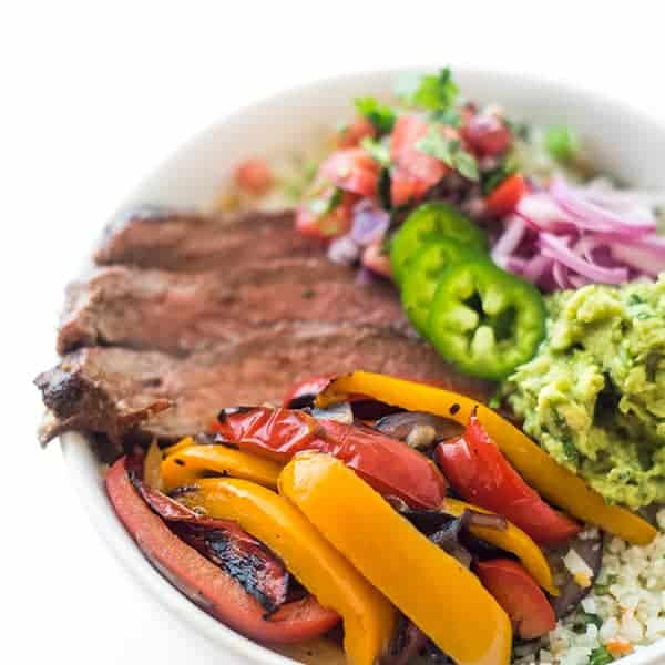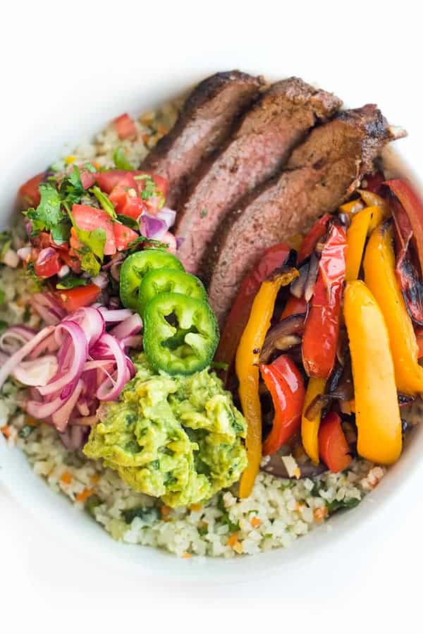 The light, almost rice-like texture of the cauliflower is the ultimate base for this flavor-packed Mexican steak fajita bowl. Flank steak is my go-to for this recipe but chicken or pork would work well too.