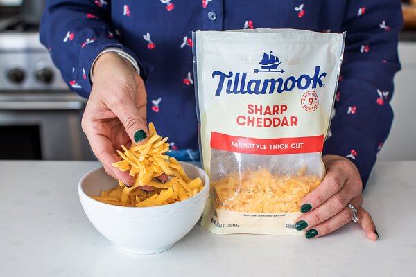 Speaking of quality ingredients, let’s start with the cheese. You already know by now that we are avid Tillamook cheese fans and for good reason: their Farmstyle Thick Cut Shredded cheese is cut in generously-sized shreds. Bigger shreds are not only better for flavor but better for melting. (Hello cheese pull!)