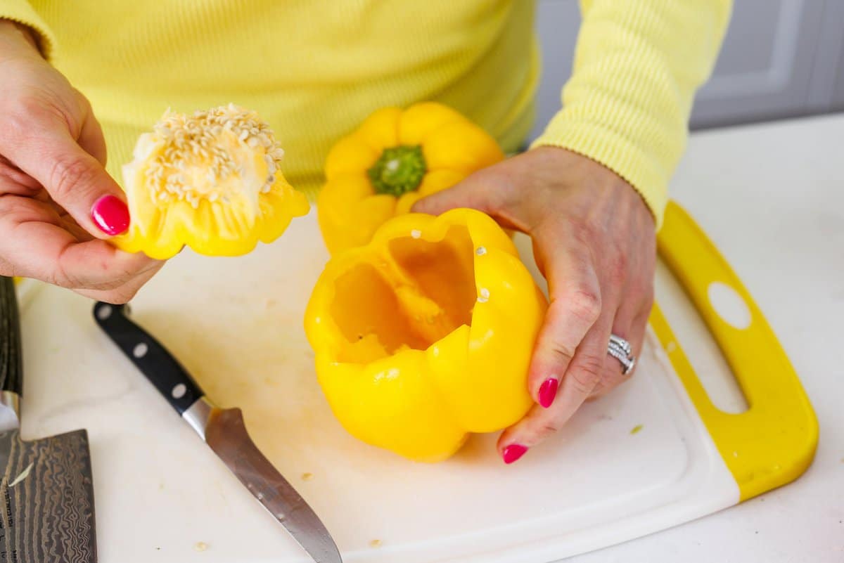 Next cut the tops off of your bell peppers, and trim out any excessive ribbing.