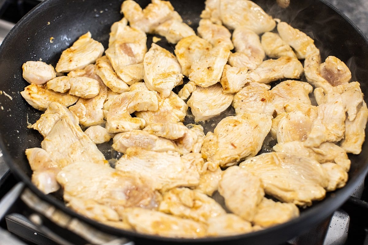 - Sprinkle chicken with salt and pepper to taste then add to the pan. Stir-fry until chicken is golden brown, about 7-9 minutes stirring frequently. Remove from pan; set aside.