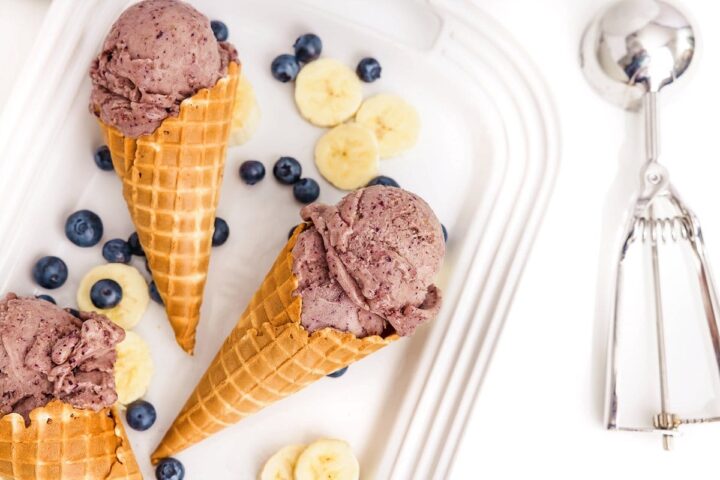 Finally, serve your vegan blueberry nice cream in a waffle cone or a bowl and enjoy.