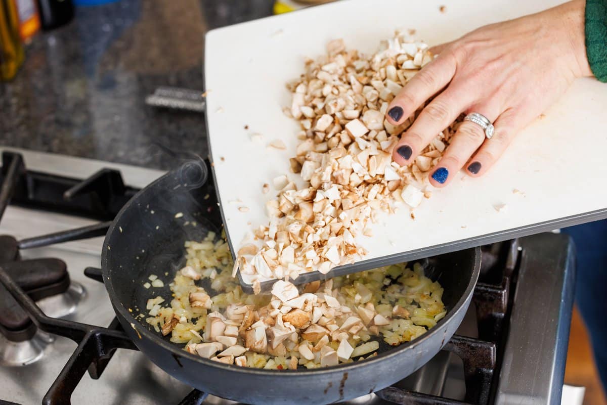 Don’t wash your mushrooms under running water, instead wipe them with a damp cloth to clean. Then you’ll pop the stems off of each, and set the caps aside. Mince the stems.