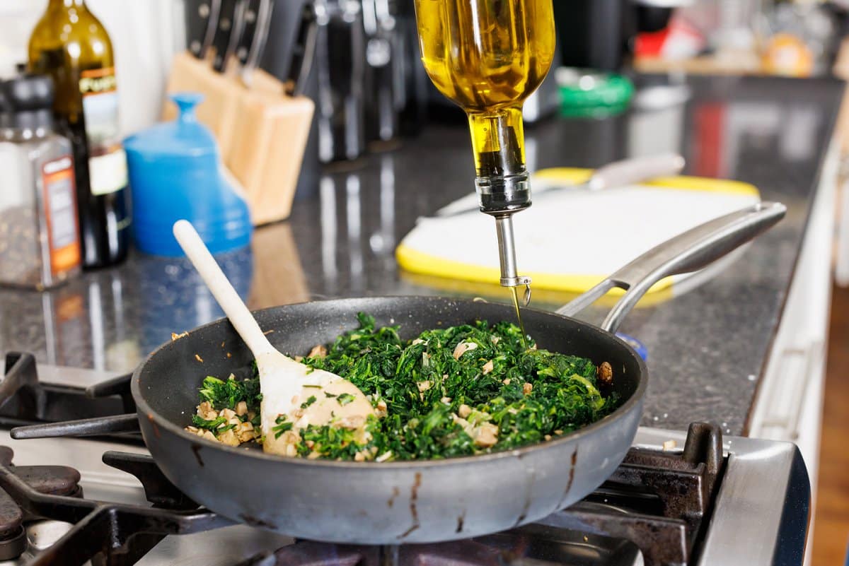 Add more oil to the pan with another pinch of salt and pepper, and continue to sauté until spinach is warmed through.