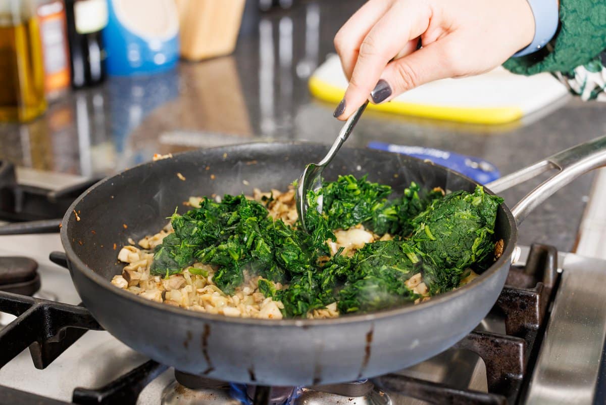 Add the thawed and drained spinach to the pan.