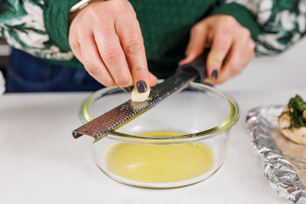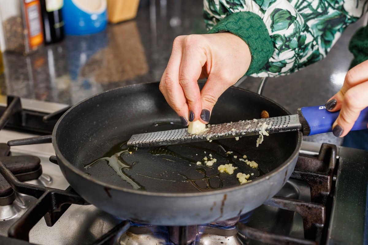 Then in a large skillet, heat some oil over medium-high heat and use a microplane to grate your 4 garlic cloves.