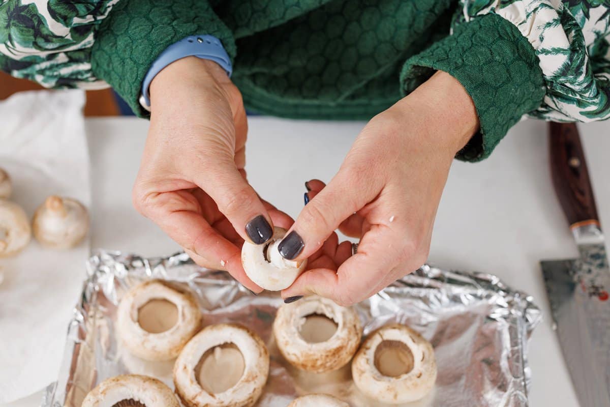 1. Pre-heat oven to 350 degrees and place mushroom caps in a single layer on a baking sheet lined with foil reserving the mushroom stems.