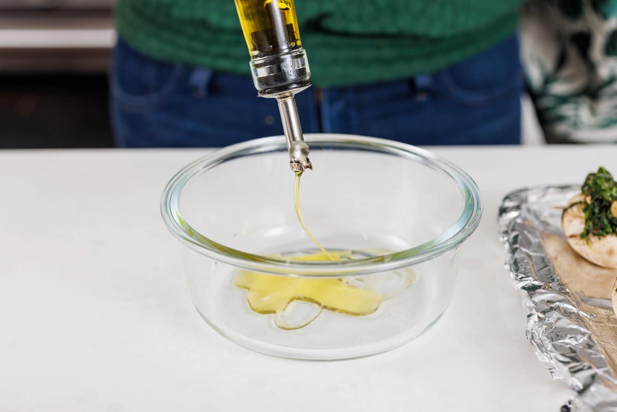 Start your Vegan Stuffed Mushrooms by preparing the mushrooms! You can use cremini, baby bella, or button mushrooms to keep the appetizer bite sized.