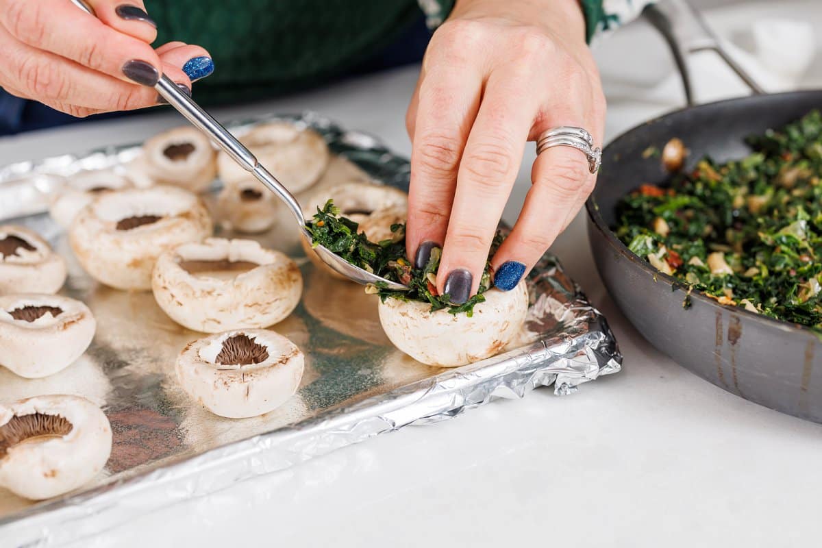 Then using a spoon, fill each mushroom cap with about 2 tablespoons of your mushroom filling.