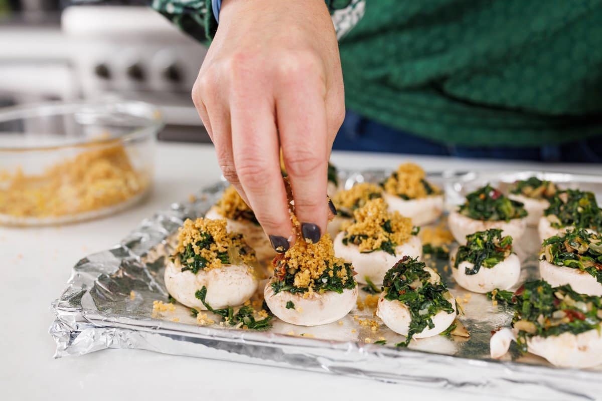 5. Using a small cookie scoop, add two tablespoons of the filling to each mushroom cap. Don’t be afraid to fill it high. Top each with a sprinkle of the panko topping.