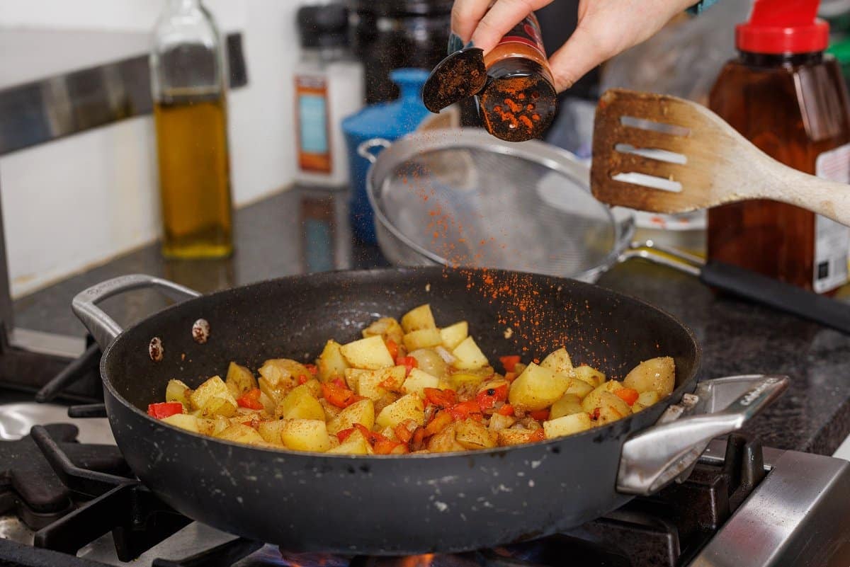 Finish with the cayenne, and stir to evenly coat and incorporate seasonings. Continue cooking until potatoes are browned and onions and peppers have caramelized.