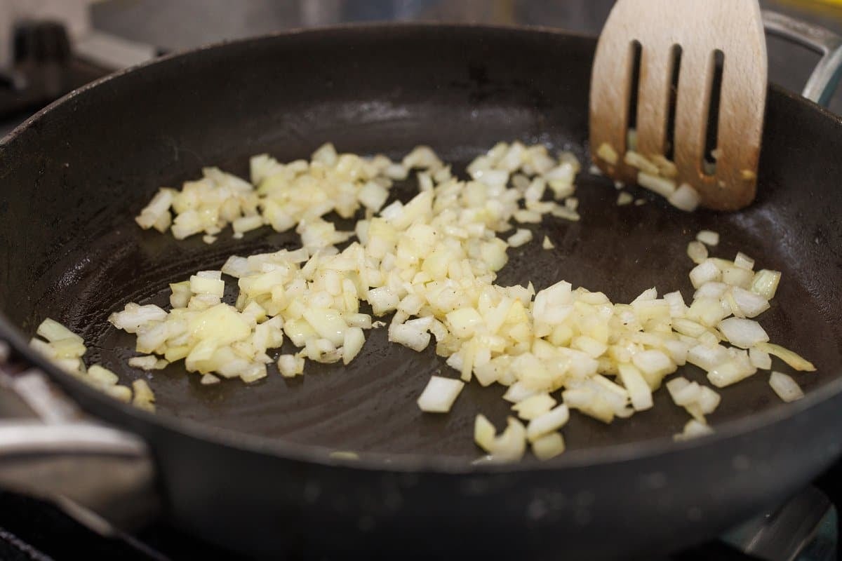 - Heat a large, deep skillet over medium high heat and drizzle with olive oil. Add onions to the pan and sauté until translucent, about 5-6 minutes. Sprinkle with salt and pepper to taste.1 tablespoon extra virgin olive oil, 1 medium onion
