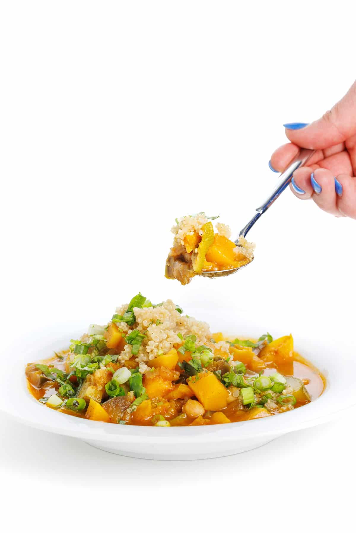 - To serve, ladle the tagine in to individual bowls then top with couscous or quinoa and sprinkle with scallions.