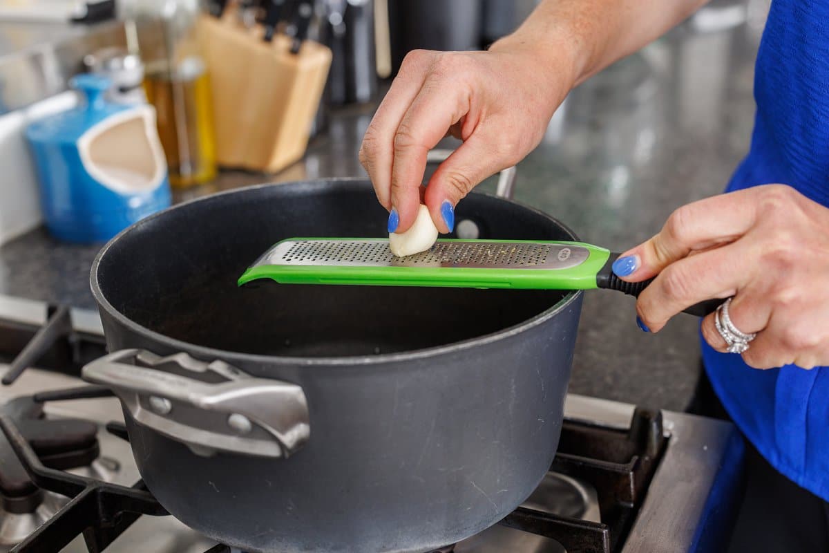 Then use a microplane to grate your garlic cloves into a large pot drizzled with some olive oil.