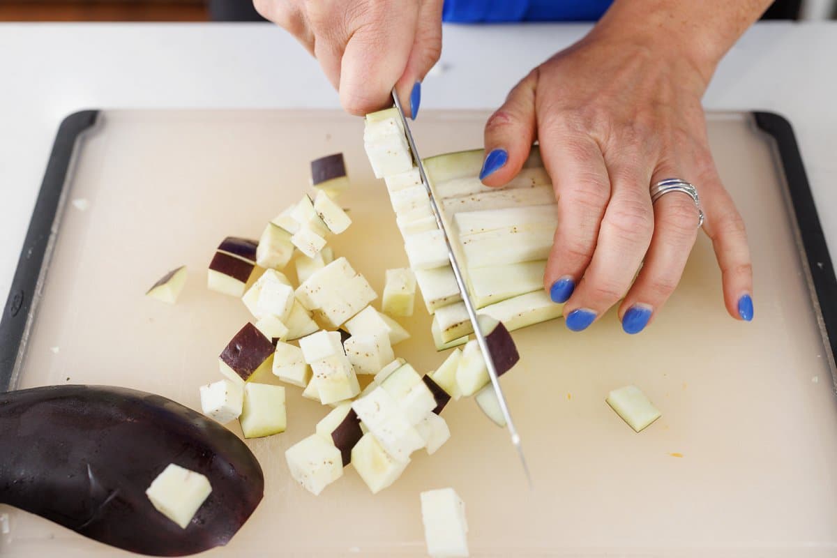 Start your Vegetable Tagine with Chickpeas by washing and peeling your vegetables and then cutting them into bite sized cubes.