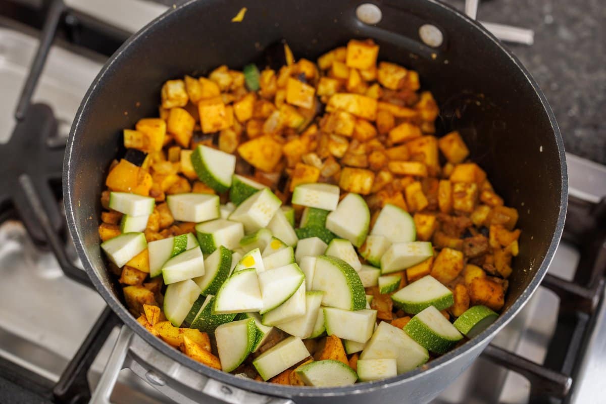 Stir in the spices, then start adding your vegetables.