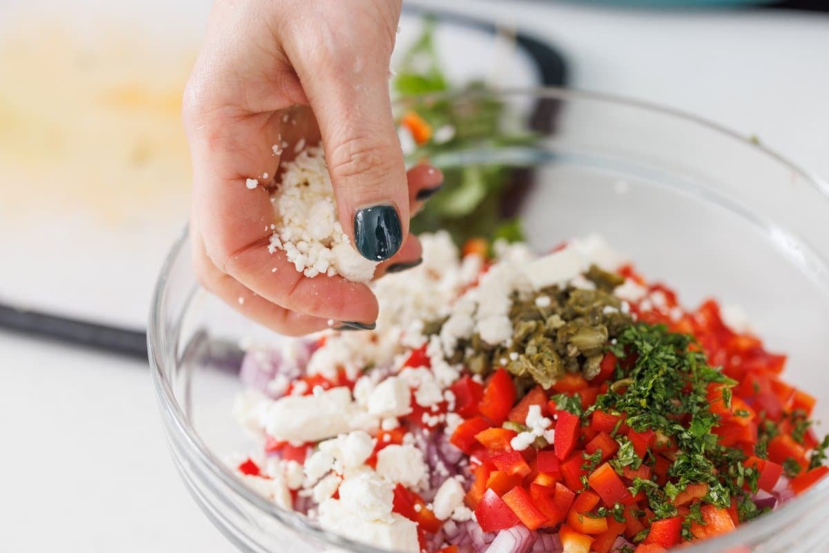 Next add the capers, mint, and feta cheese.