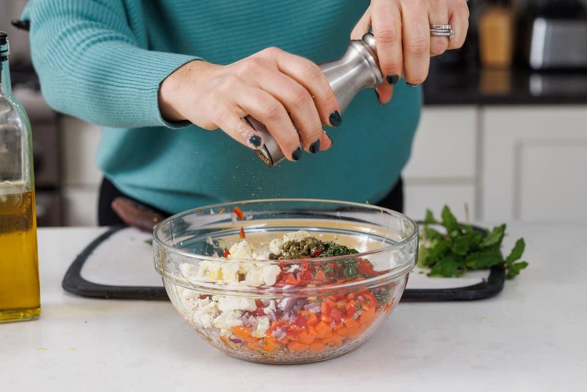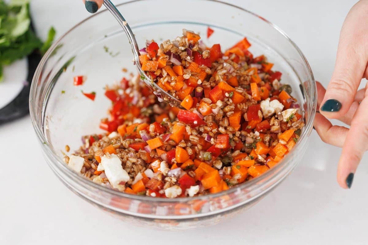 1. In a large bowl, combine cooked wheat berries with chopped veggies (red pepper, carrot and onion.) Add in feta, mint and capers.