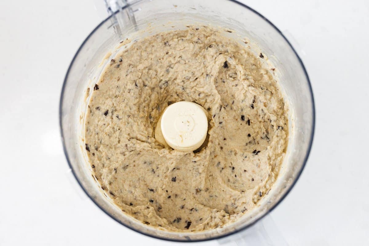 Once eggplant and cooled, add it to a food processor along with the white beans (drained and rinsed), garlic cloves, tahini, lemon juice, cumin, olive oil, salt and pepper.