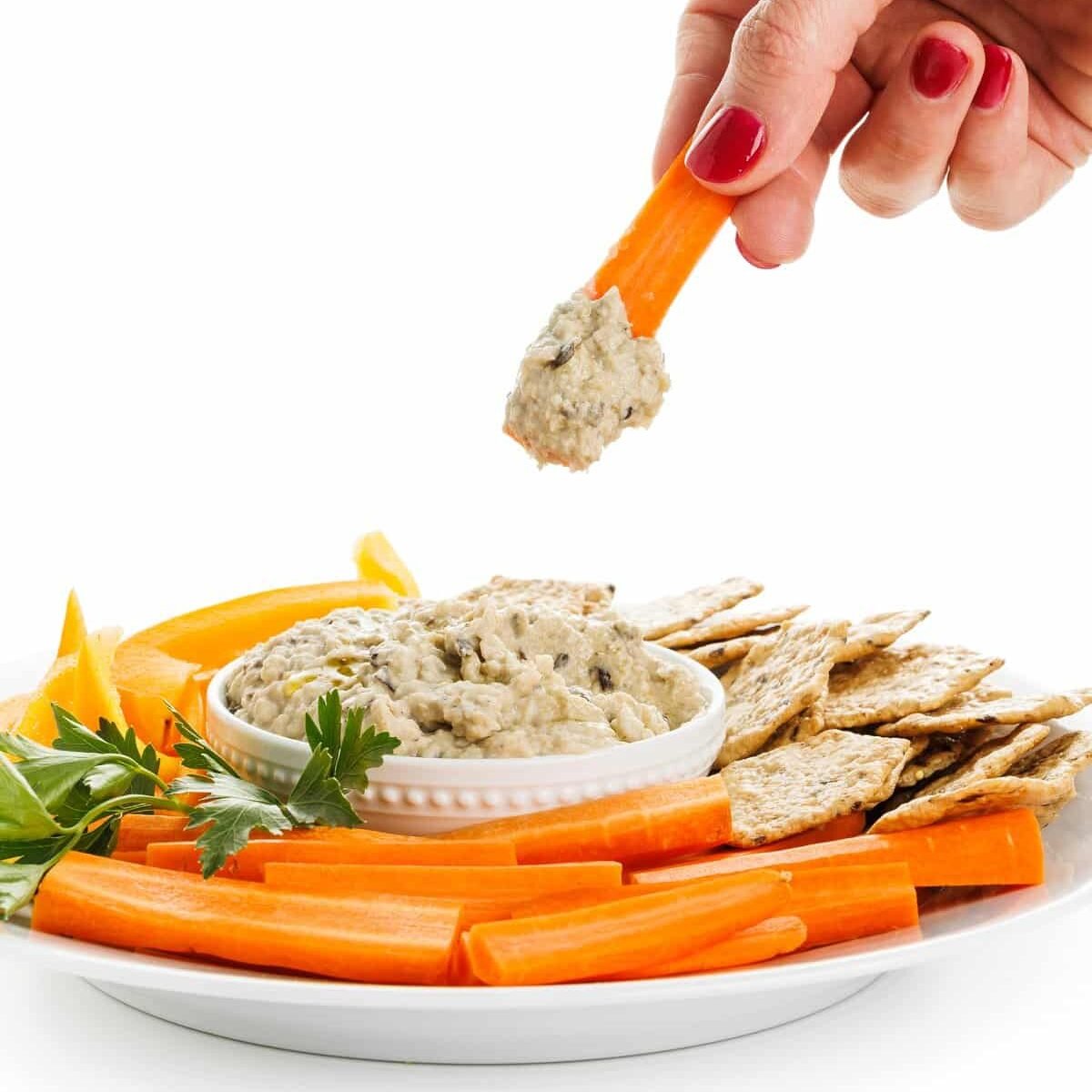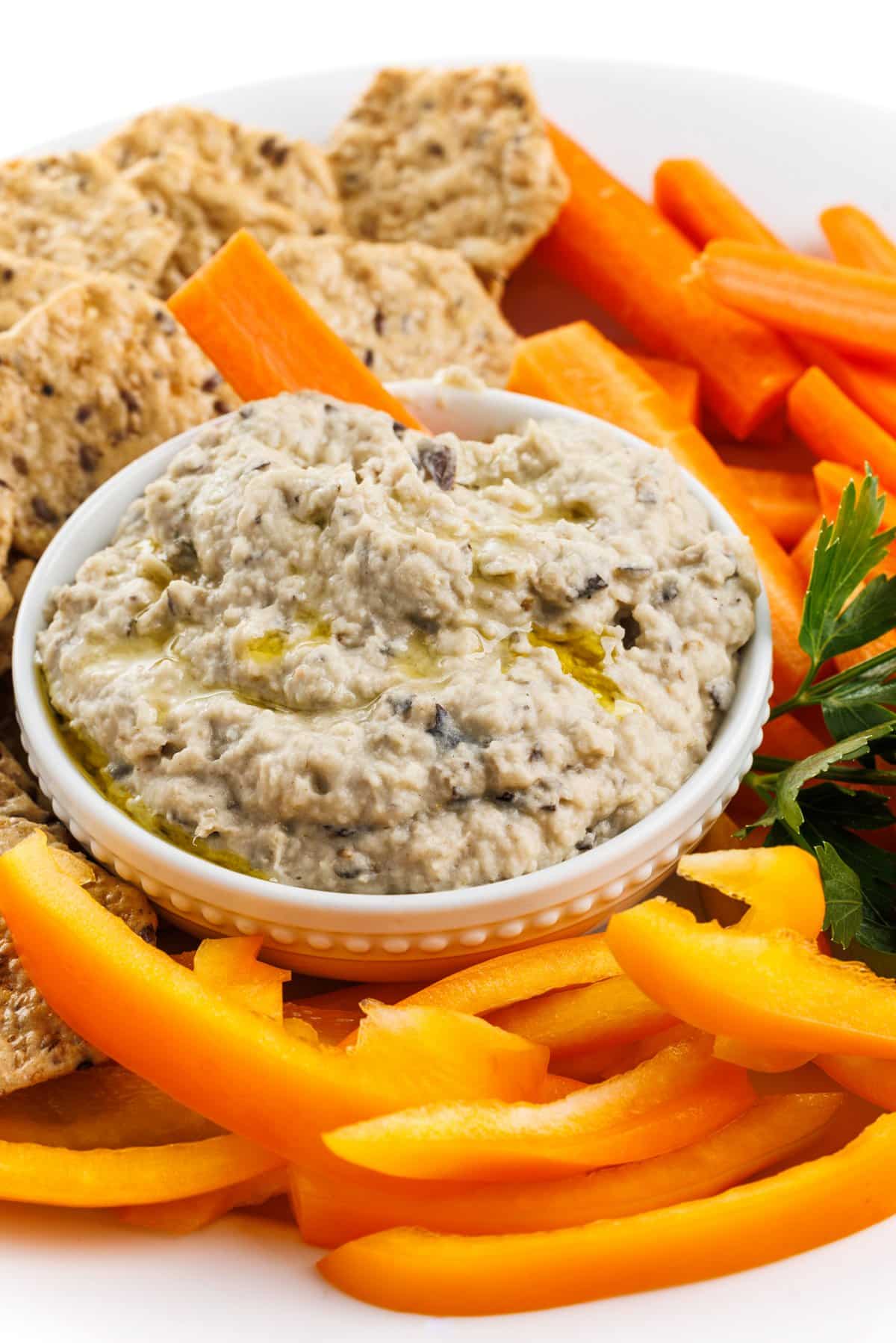 White bean and roasted eggplant dip with veggies and crackers.