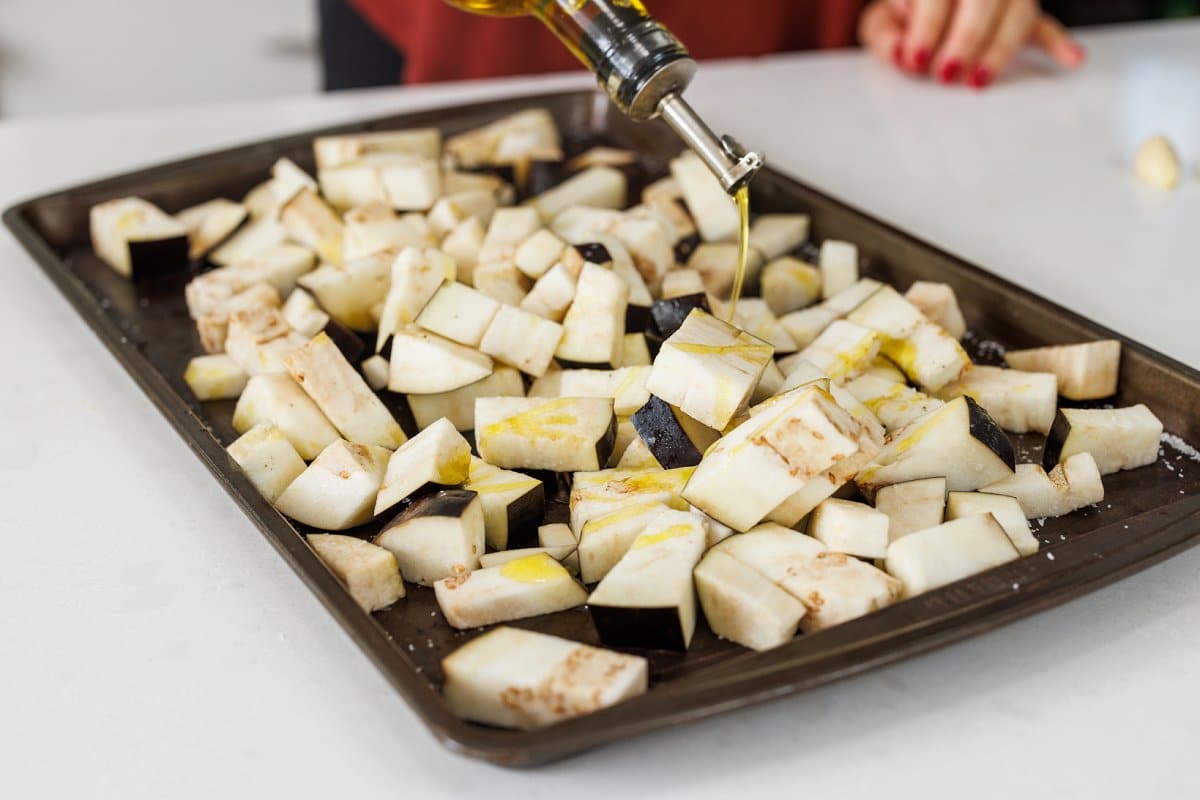 Start your white bean and roasted eggplant dip by roasting your eggplant! Cut your eggplant into one inch cubes and put on a prepared baking tray.