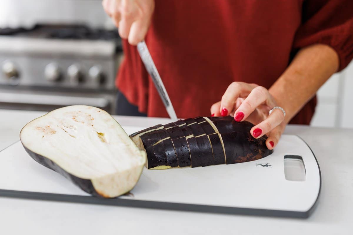 3. Bake eggplant until tender, about 20-25 minutes; let cool slightly.