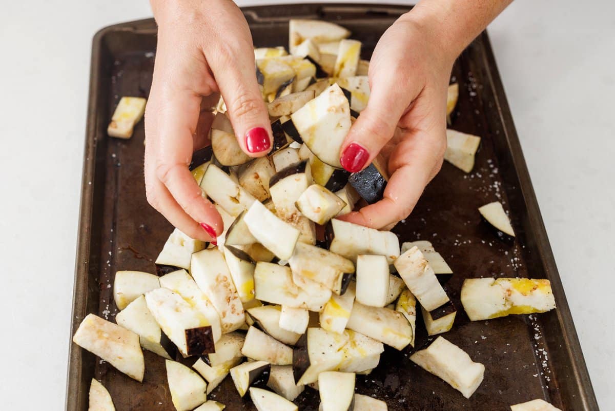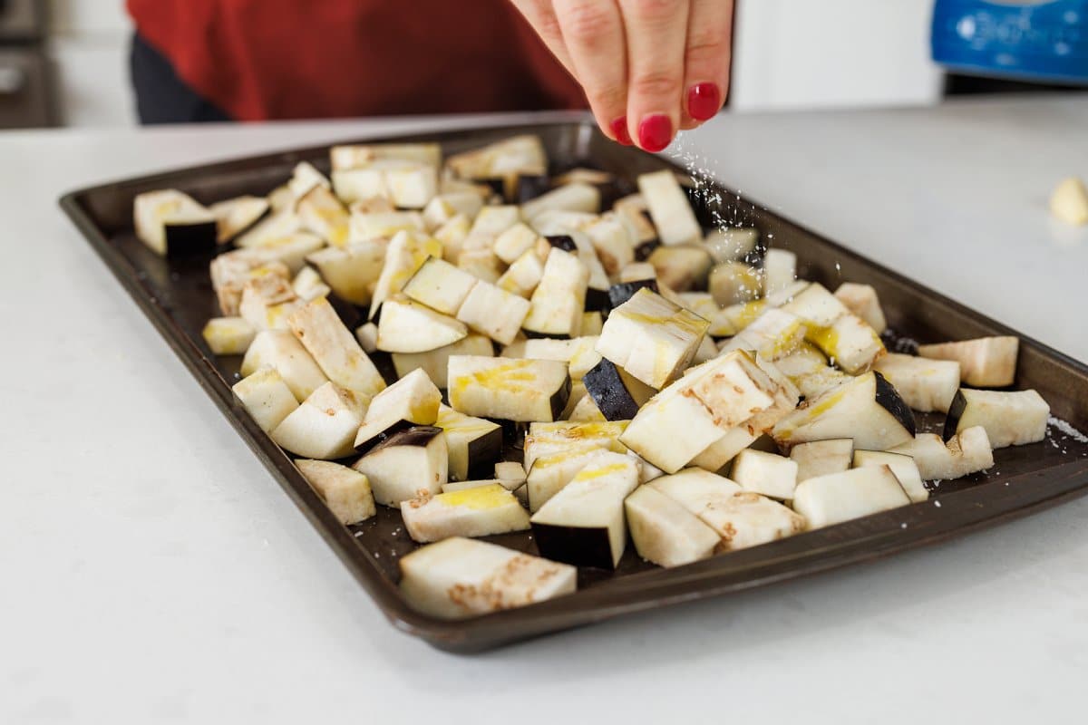 2. Spread eggplant cubes on baking sheet in one layer and drizzle with half of the olive oil (two tablespoons), half of the salt (1/2 teaspoon) and half of the pepper (1/4 teaspoon). Use hands to mix around to make sure cubes are evenly coated with oli and spices.