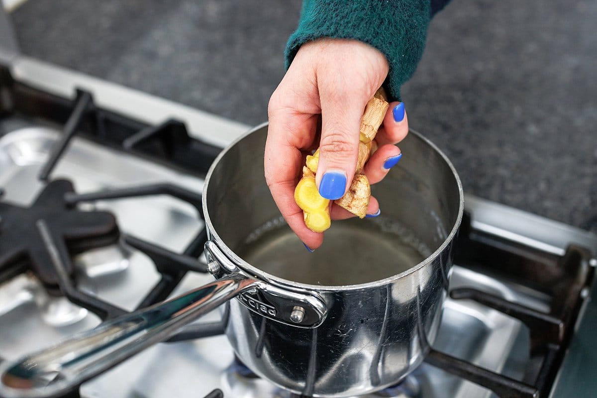 Once the sugar has all dissolved, add the ginger root and let simmer for about a minute. Then remove from heat, and let it cool while infusing the ginger flavor.