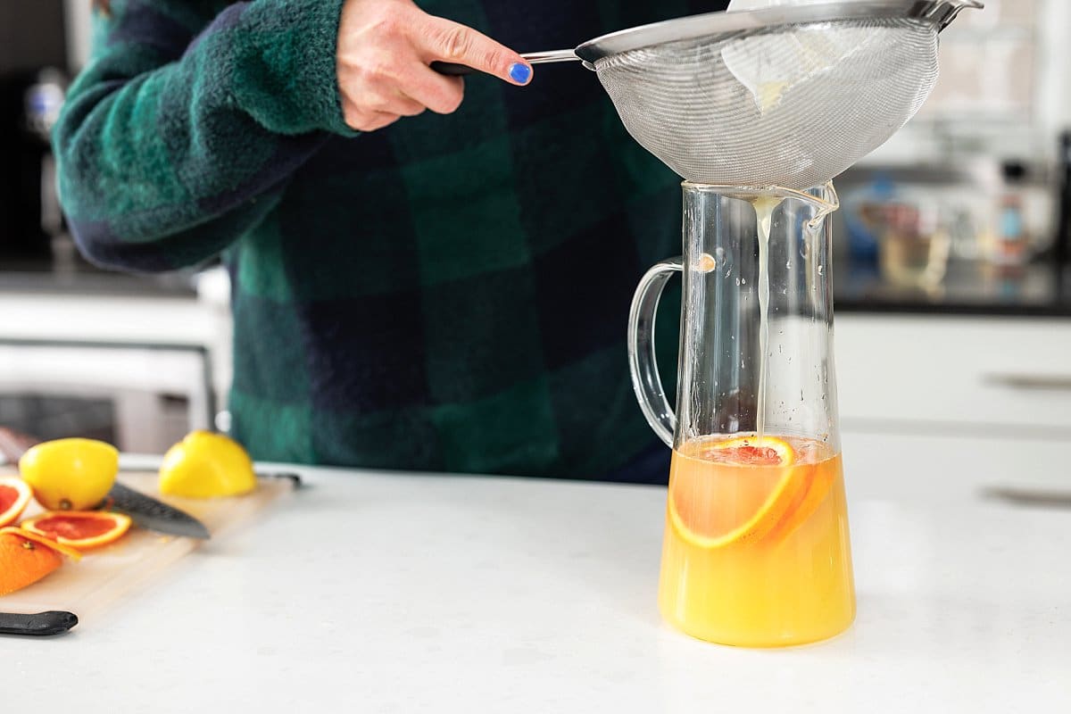 3. Once ginger simple syrup has cooled, strain ginger root from the mixture and add the syrup to the pitcher of wine and citrus juice. Stir well and let mixture chill for 4 hours or up to overnight.