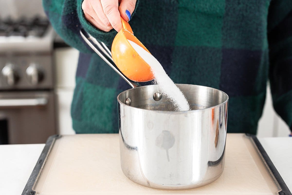 Start your White Wine Ginger Beer Sangria by making your ginger simple syrup. Add equal parts sugar and water into a saucepan, then warm over the stove and stir.