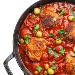 Pour whole peeled tomatoes and olives in to the pan then carefully use scissors to begin breaking down the tomatoes in to bite-sized chunks. Bring pan to a boil then reduce to simmer. Add in bay leaves then cover pot with a tight lid. Let simmer until tender, about 30 minutes. Garnish with fresh parsley to serve!