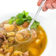Add the broth to the pot and carefully deglaze the pan using a wooden spoon to scrape up any browned bits from the bottom. Stir In potatoes along with another pinch salt and pepper. Bring to a boil then reduce to a simmer until potatoes are tender, about 20 minutes.
