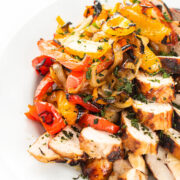In a large resealable plastic bag, add all of the grilled vegetables ingredients (peppers through ginger.) Seal tightly and toss well to coat evenly.