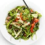 8 cups arugula, 1/2 cup red onion, 1 medium tomato, 1/4 cup shaved Parmesan