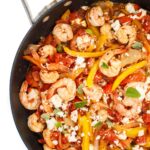 Return shrimp to the pan and add white wine. Use a wooden spoon to deglaze the bottom of the pan and continue to heat until alcohol burns off a bit, about 60 seconds.