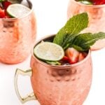 Take one of limes and cut in half then quarter each half. Place lime wedges in a large pitcher along with mint leaves and strawberries. Using a muddler or the back of a wooden spoon start mashing the fruit and herbs together to release the flavors.