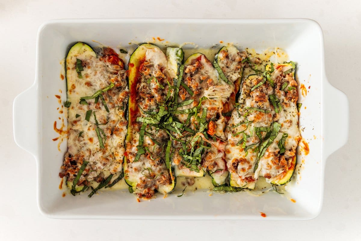 4. Remove zucchini from oven and pat any moisture that may have accumulated with paper towel. Spread about two tablespoons of marinara sauce in the middle of each zucchini half then top with cooked Italian sausage crumbles, mozzarella cheese and a sprinkle of parmesan. Repeat until all halves are filled then bake for 5 minutes before turning oven to broil then broiling for 3-4 minutes until golden brown. Serve with optional garnish of fresh basil and chili flakes.